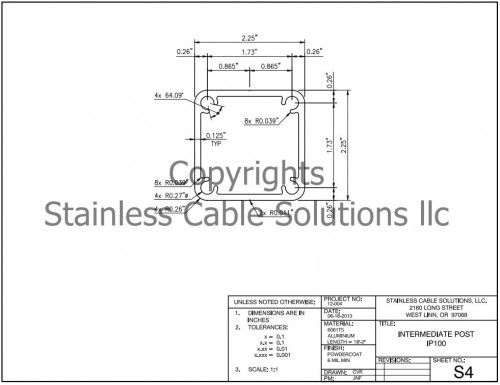 Stainless Cable Solutions manufactures aluminum posts that feature a 1/8" wall thickness, and are designed to easily hold the lateral force required by code. Since they're only used to provide top rail support without supporting cable load, our IP100 posts do not have internal ribs.
