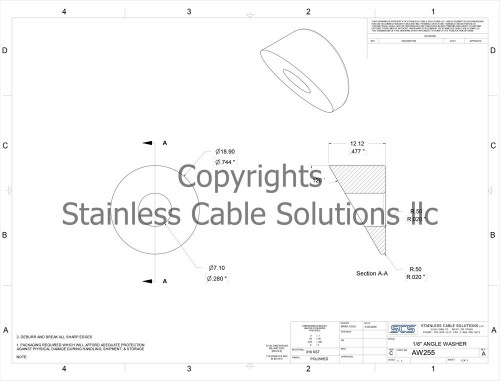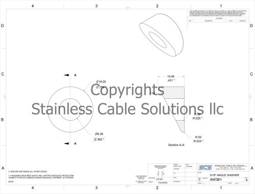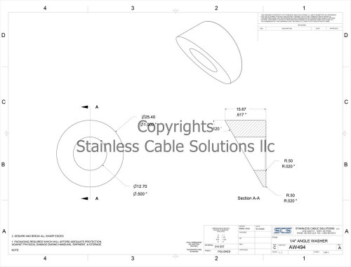Our 30-degree angle washer is commonly used for stair applications or angled installations where cable railing transitions are required. Designed to work with button terminals, this washer provides a smooth, flush finish, minimizing visual obstruction while supporting tensioned cable.