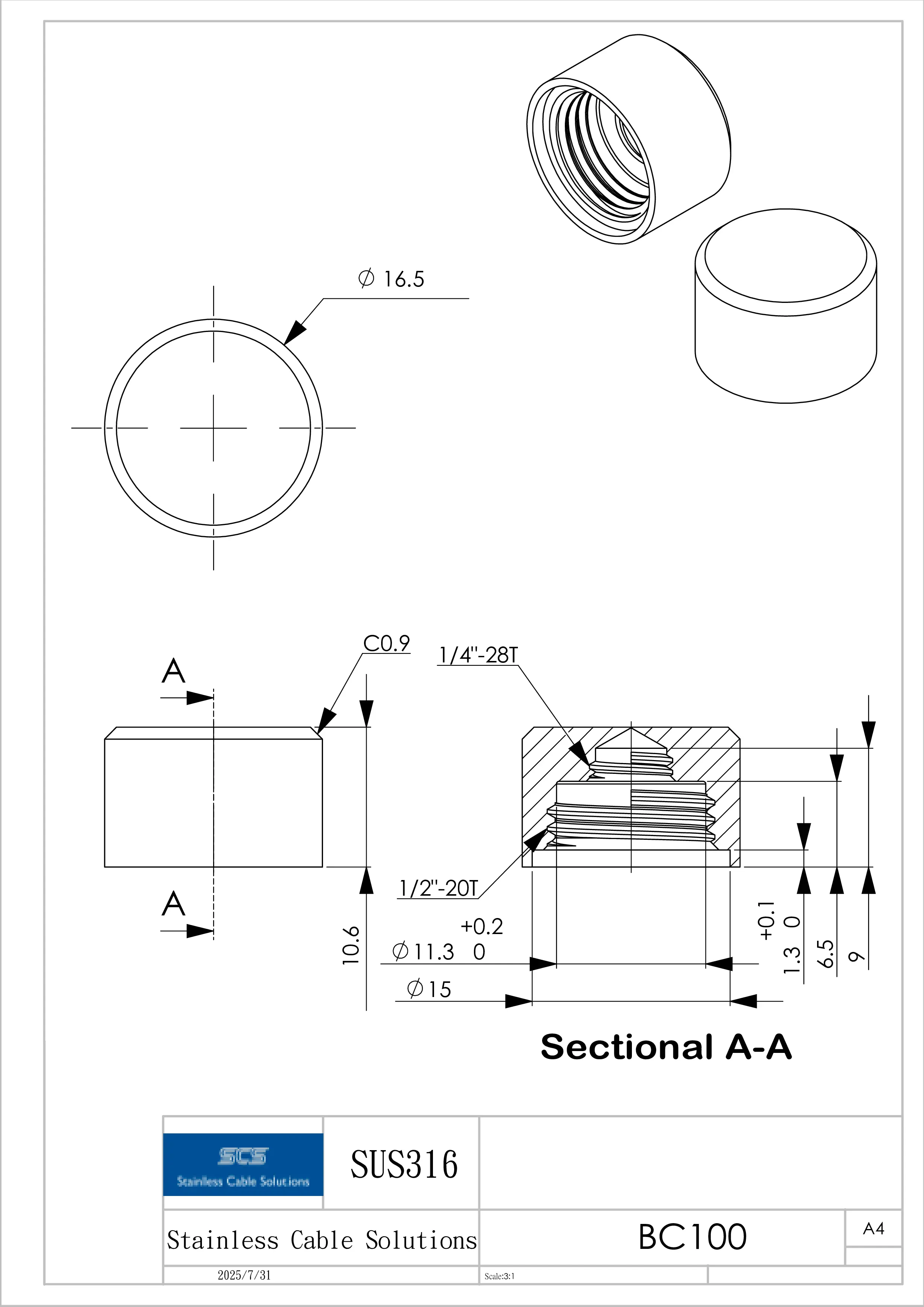 The new SCS Button Cap is the clean, durable way to keep the outside face of your posts looking neat. The Button Cap is threaded to accept the outside threads of the Quick Lock Termination and has inside threads for the ¼_ 28 threads of the Quick Lock Tensioning hardware. Matching Button Cap ends ensure that your cable rail project will look professional and will not fall off over time. No more cheap plastic caps that will fall off over time.