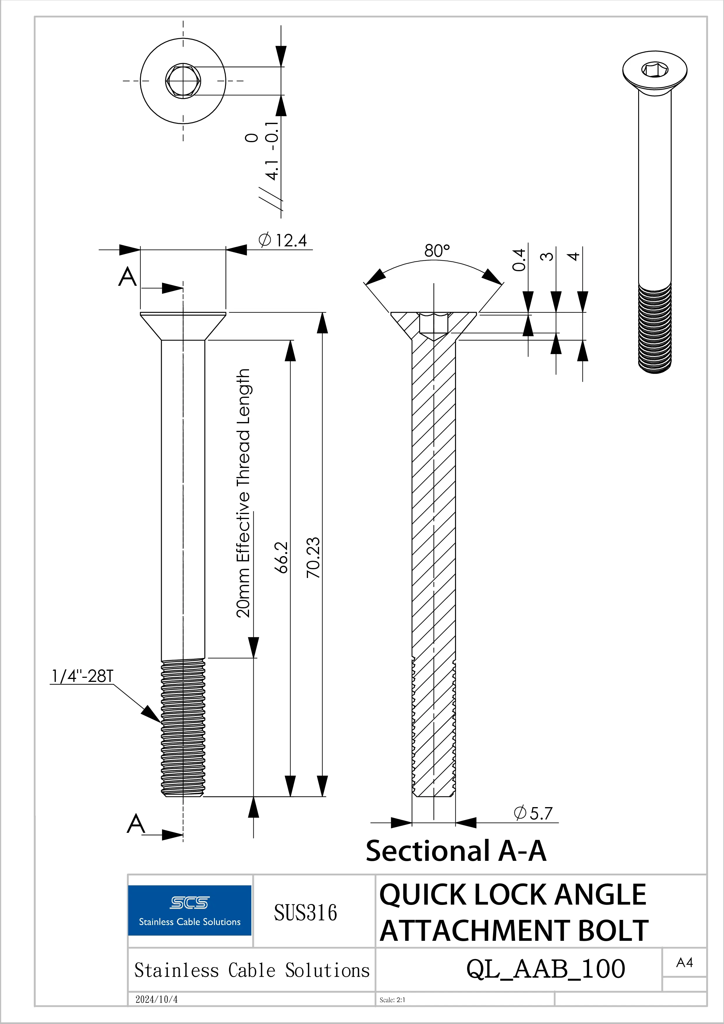 The Quick Lock Angle Attachment Bolt is included with all of your stair hardware. The bolt is specifically designed and engineered to fit SCS posts perfectly. Just slide the QL_AAB_100 into the pre–drilled horizontally drilled posts, and your stair hardware will articulate to the angle of the stairs! Cap with the Button Cap for a perfect finished look. No more cutting off excess hardware bolts and installing acorn nuts. The Quick Lock Angle Attachment bolt fits SCS posts perfectly with no excess bolt on the outside face!