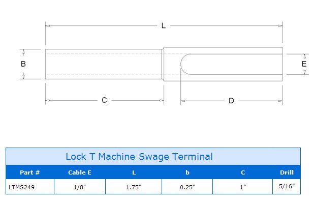 Perfect for hollow-core posts, the Lock T Terminal is available for 1/8" cable and is swaged at our facility for a precise fit. It's ideal for 90-degree bends and stair installations, where the cable needs to mollie inside the post for a clean, internal hold.